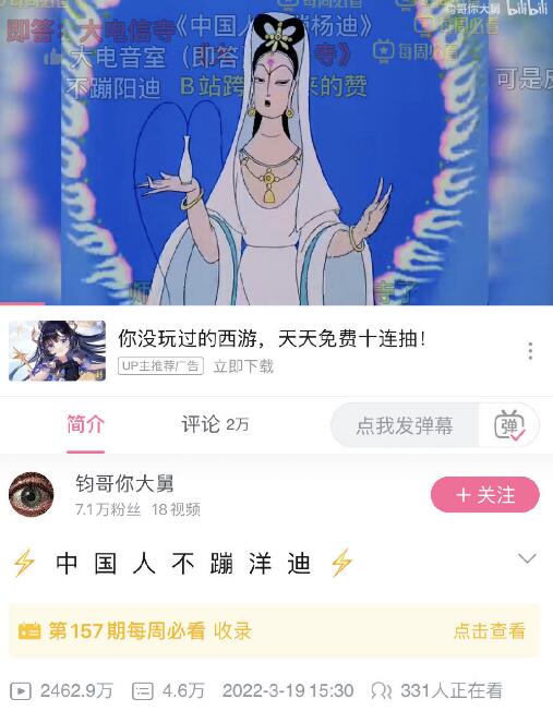 "中国人不蹦洋迪"出自视频博主@钧哥你大舅 制作的MAD视频的标题,将上海美术电影制片厂的一些知名IP动画混剪,配上birty cLass制作的电音《China》,这首电音是改编自佤族民歌《加林赛》。