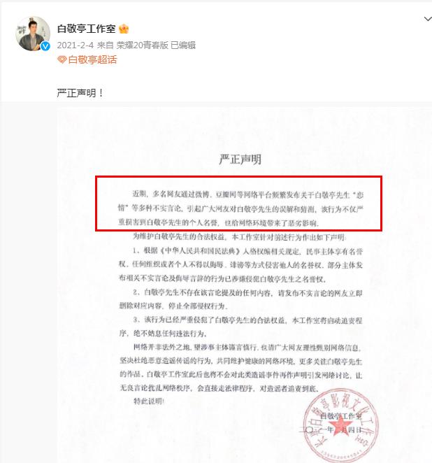 近期(2021年2月4日),多名网友通过微博、豆瓣网等网络平台繁发布关于白敬亭先生“恋情”等多种不实言论,引起广大网友对白敬亭先生的误解和猜测。该行为不仪严重损害到白敬亭先生的个人名誉,也给网络环境带来了恶劣影响,