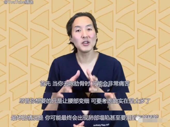 其实在国外抽肋骨瘦腰的手术并不少见,通过手术抽掉肋骨最下面的2-6根浮肋,在人工做出腰部凹槽,术后就可以让腰部出现完美的曲线了,但这种手术并不推荐大家去做。它的缺点也是显而易见的: