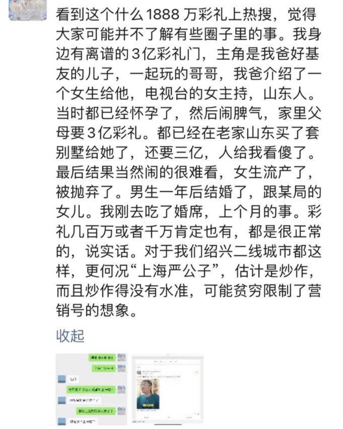 知乎小管家称,我们进一步核查了其过往发布内容,发现该用户存在以互相矛盾的身份发布内容的行为。依据《知乎社区规范》,该用户存在“胡编乱造虚假或引人误解的背景、情节,欺骗、误导他人”的行为,引发严重后果,平台决定对该用户帐号永久封禁。 下面是早先的网络上流传的内容: 在知乎上,有一个问题是《大家觉得江西的女生怎么样?》在这个问题的答案列表里面,有一个“匿名用户”在谈到江西女生彩礼问题的时候表示:“江西彩礼行情几十万,你们都太天真”,然后开始娓娓道来自己女朋友和其父母对自己的彩礼要求,内容普通人会看的瞠目结舌: 她父母开的条件是1888万现金加婚房过户到她名下(大概价值四千五百万,父母出的全款在我名下),加本地买一套目测几百万让她探亲的时候住,上百个每个亲戚每人十万红包,机票头等舱加利兹卡尔顿(她设想的婚礼酒店)去观礼,还有一堆琐碎的比如钻戒,金饰品我就不罗列了。另外生一个孩子要奖励一千万现金和一套不少于两千万房产。我听的瞠目结舌。她的父亲说,我们知道你家里有多少钱,要的这点不过是你家拿出来的四五分之一,难道结亲家你连这点都不想出吗?接着他就掰着手指头给我算了一下我家有多少钱、多少房,并反复跟我说要看我的诚意。 网友的这般描述,再加上是“匿名”回答,很多网友觉得是吹牛,不过很快就有知情的网友表示,这位匿名回答者早已被开盒(开盲盒,知道是谁了的意思),是“上海严公子”,父亲是上海静安区某保险公司的老总,母亲是主任。网友表示隔壁的昆山、苏州都知道严家大公子找了个村姑,然后被拿捏。 这个一眼看起来是假的事,被扒到最后居然是真的,这个答主把他爸妈的职业信息调转了一下就在知乎发帖吐槽结果被认出来了,家里确实上流。现在好像在他们那个圈子出名了,整个圈子都知道老严家的傻儿子把个江西村姑当真命天女,结果被这个村姑的七大姑八大姨敲几千万的竹杠。 ![]() 对于1888万天价彩礼的事,浙江绍兴的一个网友还发了自己身边的一个亲身经历,他说: “看到这个什么1888万彩礼上热搜,觉得大家可能并不了解有些圈子里的事。我身边有离谱的3亿彩礼门,主角是我爸好基友的儿子,一起玩的哥哥,我爸介绍了一个女生给他,电视台的女主持,山东人。当时都已经怀孕了,然后闹脾气,家里父母要3亿彩礼。都已经在老家山东买了套别墅给她了,还要三亿,人给我看傻了。 ![]() 目前不少网友表示:“感觉这个严公子应该是还可以的一个孩子,就是不懂这个江西女孩的父母为什么这个眼界。还有男孩的父母,不错,我喜欢这个作风,结婚都让男孩自己遭受毒打,以后肯定能娶个好姑娘回去,没什么可笑话的,这个严公子应该很务实。” ![]() |