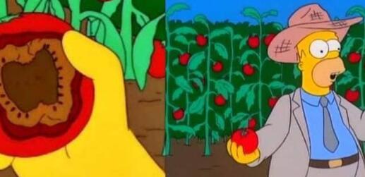 在1994年的11季季里,辛普森一家去农场居住,由于不会种植蔬菜,他们便从自家核工厂里取出了很多核物质的书,结果长出的西红柿变异,根本不能吃。这样的描述非常像此后的日本福岛核电站泄露导致的蔬菜水果大面积变异事件。