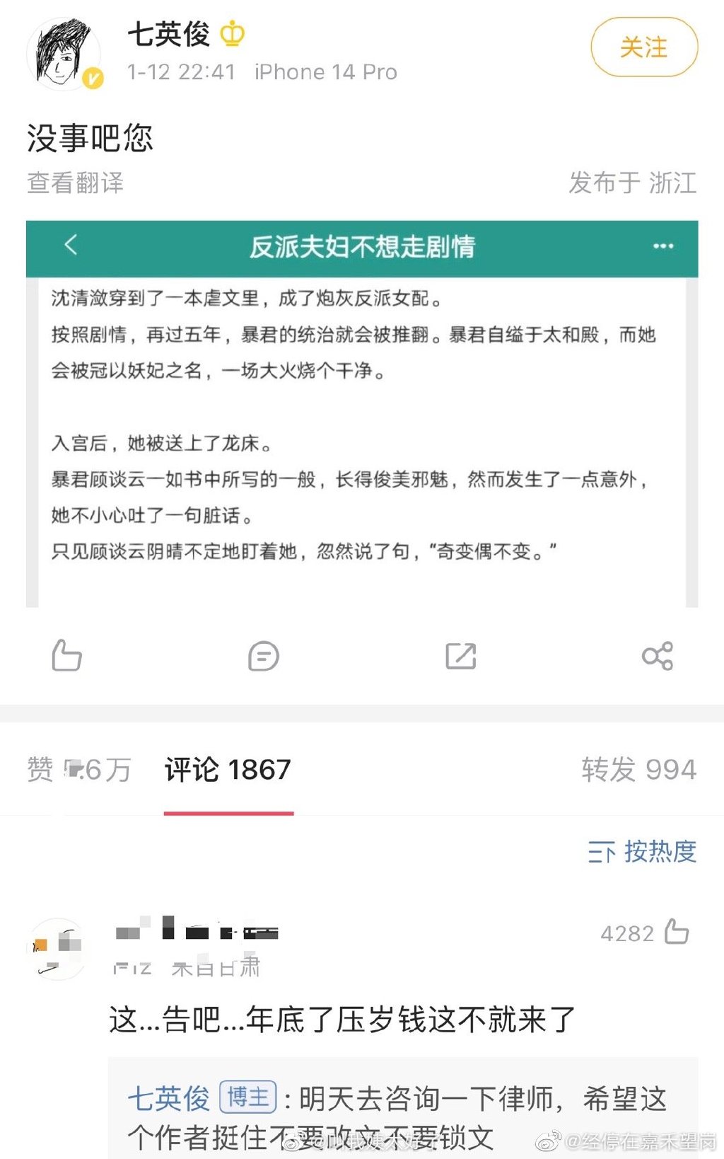 4.被七英俊说“抄袭”的@晋江华九灯开通微博账号进行解释,说她没看过七英俊的书。