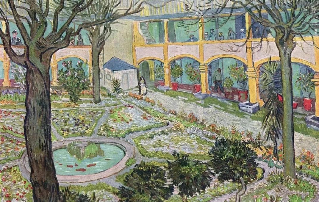 梵高在割掉耳朵后,住进了阿尔勒的医院。在这里疗养期间,他创作了《阿尔勒医院的庭院》,用浓烈的色彩描绘了当时庭院里花园的样子,从画中看,梵高的视角是处于比较高的二楼。阿尔勒的医院后来改建为梵高空间,成为古城重要的文化场所,偶尔会办一些展览,一层的几间店铺售卖纪念品。