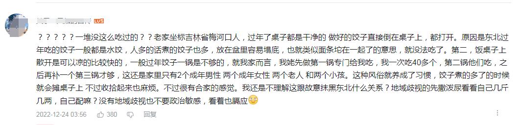 很多东北地区的网友,表示自己家并不是这种吃法,也没见过身边的人这么吃,说这些吃“桌饺”的主播都是为了吸引流量而已。逐渐的吃桌饺也与地狱黑挂上了钩,很多东北地区的网友,说东北人吃桌饺是故意在黑东北人。