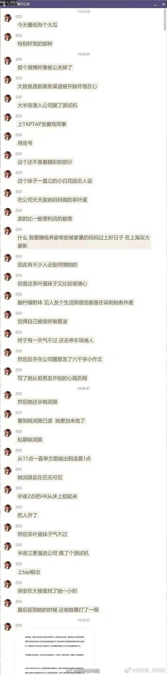 网友对该事件的总结:叠纸一个员工立的励志小白花人设,天天在公司卖茶叶蛋,但是她本人就很敏感,觉得别人霸凌她,讽刺她,有一天忍不住下去,写了6000字小作文,还发给了姚润昊,发现姚润昊已读,就一直给他发私信,到半夜一两点,然后气的姚润昊,凌晨两点就打电话叫HR,把她开了之后,这个妹子就潜进大楼,用测试机上官博发疯,还锤了无期迷途私生子的身份,保安去找了这个妹子,一个小时,最后找到了,据说还被妹子暴打一顿,太丢人了估计姚润昊气得不行。
