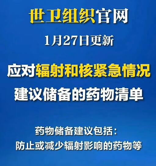 据世卫组织官网发布的“世卫组织更新用于应对辐射和核紧急情况的关键药物清单”,这些药物储备建议,包括防止或减少辐射影响的药物,或在接触辐射后用于治疗损伤的药物。