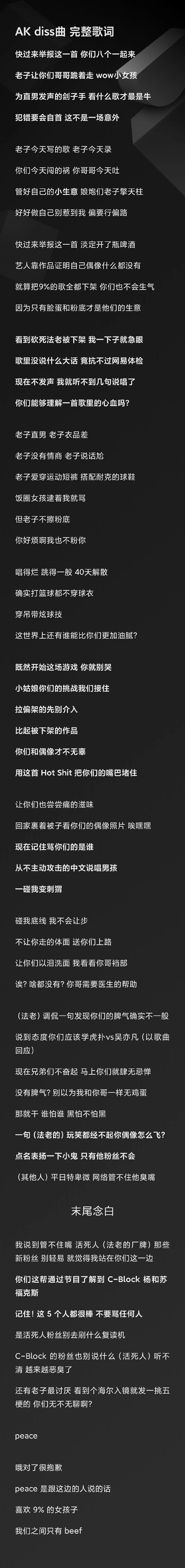 刘彰diss事件指的是法老出歌其中有一句diss了9%,被其粉丝爆破下架了十几首歌(属于连坐),随后AK出歌diss粉丝。下图是AKdiss粉丝的歌词: