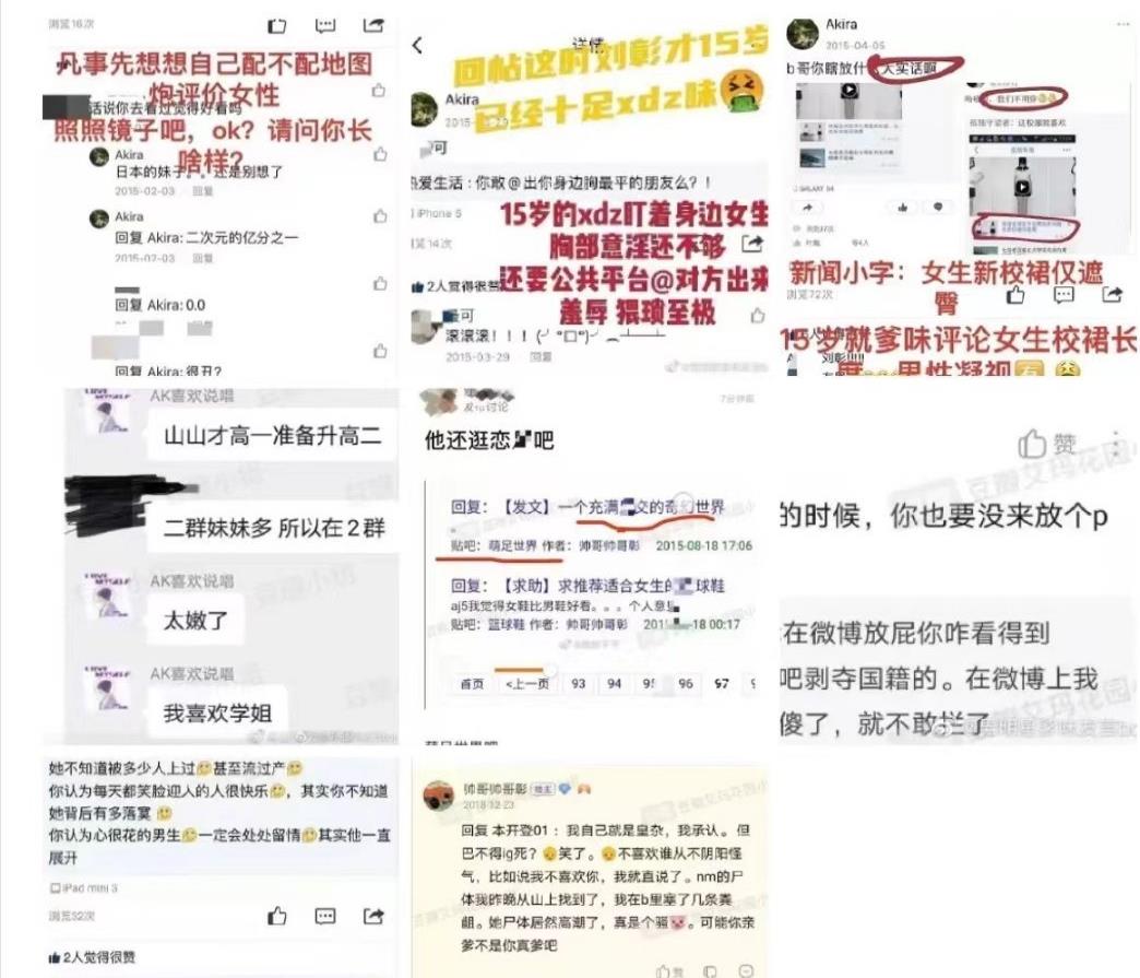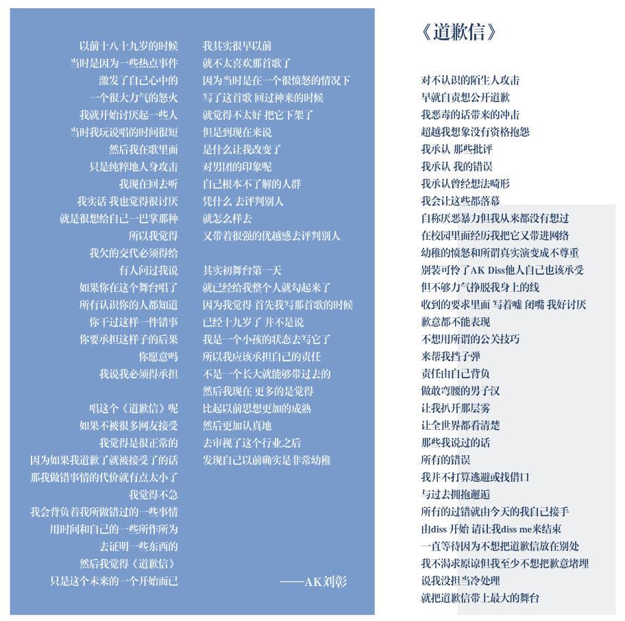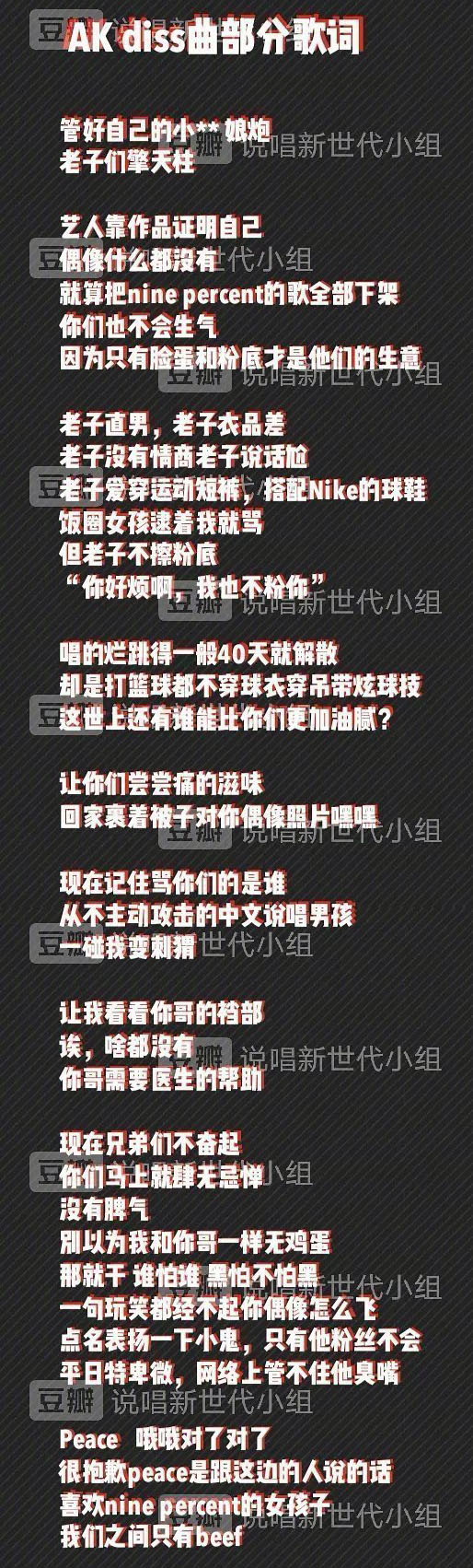 ![]() 而下图则是是粉丝口中的歌词,我们看,粉丝们口中的歌词是DISS了"NINE PERCENT"组合,该组合由队长及C位蔡徐坤、成员陈立农、范丞丞、黄明昊(Justin)、林彦俊、朱正廷、王子异、小鬼(王琳凯)、尤长靖组成。 ![]() 除了DISS爱豆,刘彰还曾经DISS女孩,没出道之前曾经在QQ贴吧等发表了一些不当言论 ![]() 后来,在参加创造营的时候,刘彰也认识到了自己以前的错误,在初舞台加试用一首原创《道歉信》向曾经diss爱豆表达歉意。“由diss 开始的事件请让我diss me来结束,一直等待这刻因为不想把道歉信放在别处。我不渴求原谅但我至少不想把歉意堵埋,说我没担当冷处理就把道歉信带上最大舞台。”下面是道歉信原文 ![]() 最后说一些关于刘彰的题外话: