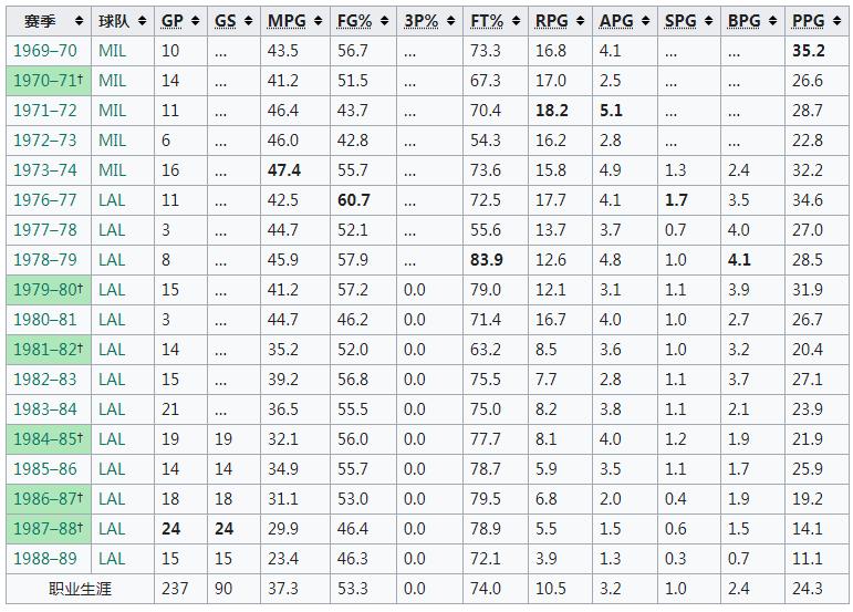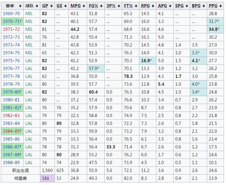 贾霸在NBA整整打了20个赛季,到1989年才宣布退役,总得分38,387分,是NBA历史第二高纪录(第一是1984年出生的詹姆斯),下面是赛季数据统计表: NBA例行赛 ![]() NBA季后赛 ![]() NBA射手得分榜最新排名:
