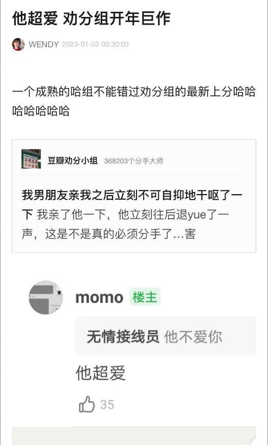 出自豆瓣劝分小组,网友A发帖问自己的男友亲自己和自己亲热时,会不可自抑的干呕,是不是要分手了?
