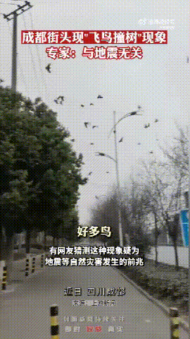 近日,一段“飞鸟撞树”的视频在网络上传开,视频显示,成都街头某路段出现大量飞鸟“撞”向路边大树,有网友猜测这是地震等自然灾害发生的前兆。针对此事,成都野保专委会秘书长巫嘉伟表示,飞鸟并非撞大树,可能是成都的灰椋鸟和丝光椋鸟成群结队在此觅食,也有可能这棵树是“夜栖树”,两种情况都与地震无关。