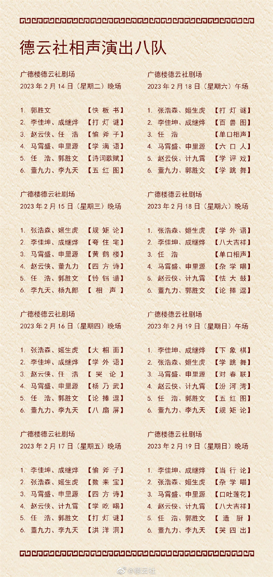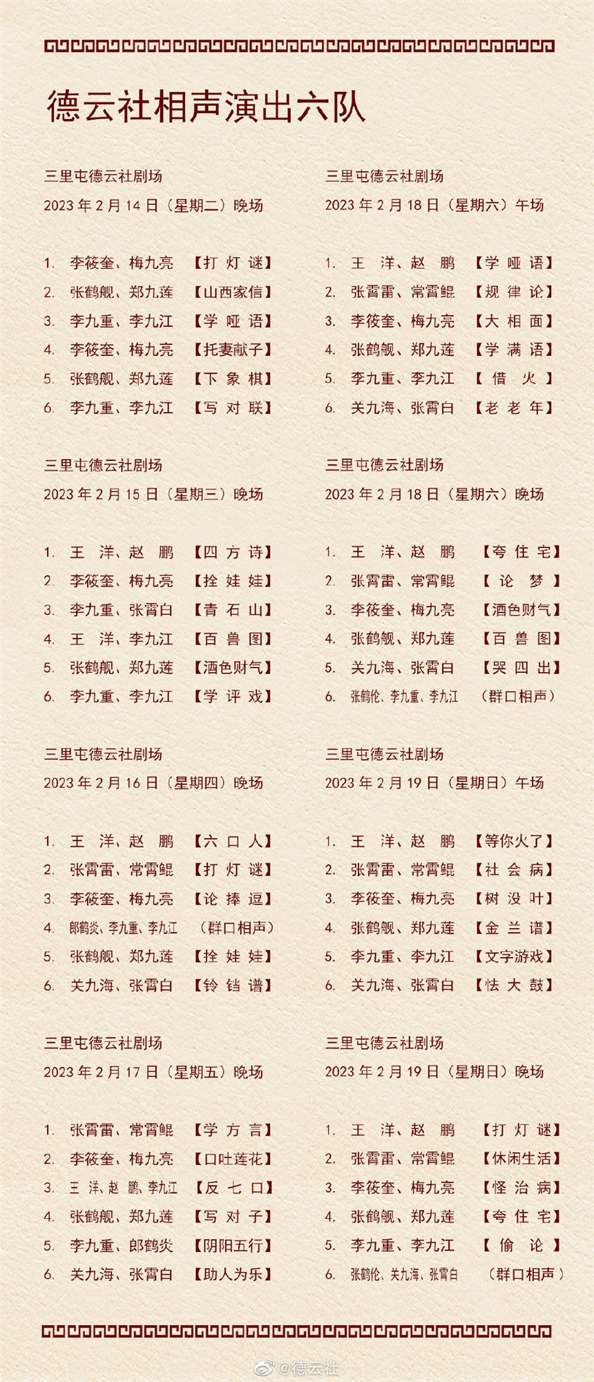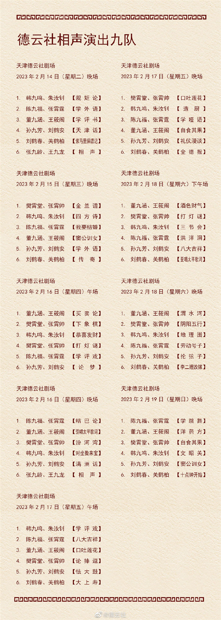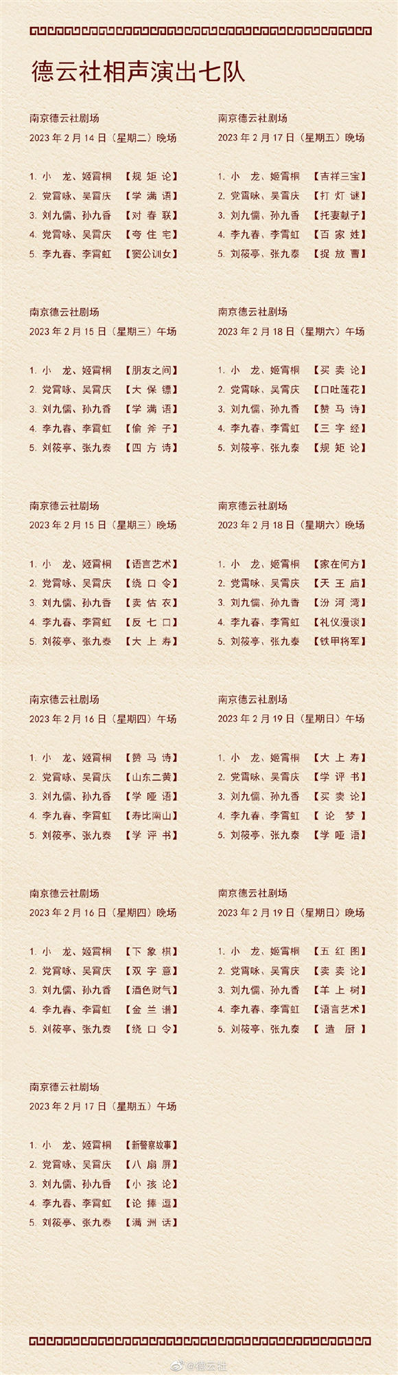 日前,德云社公布了2023年2月13日-2月19日,德云社9个小队的演出节目单。