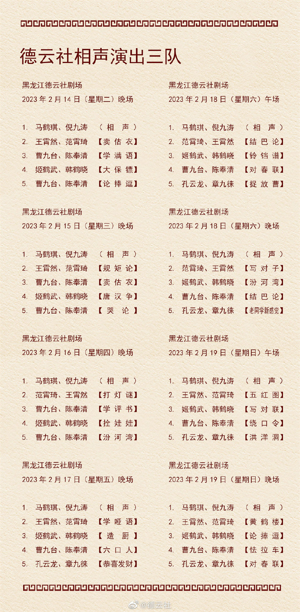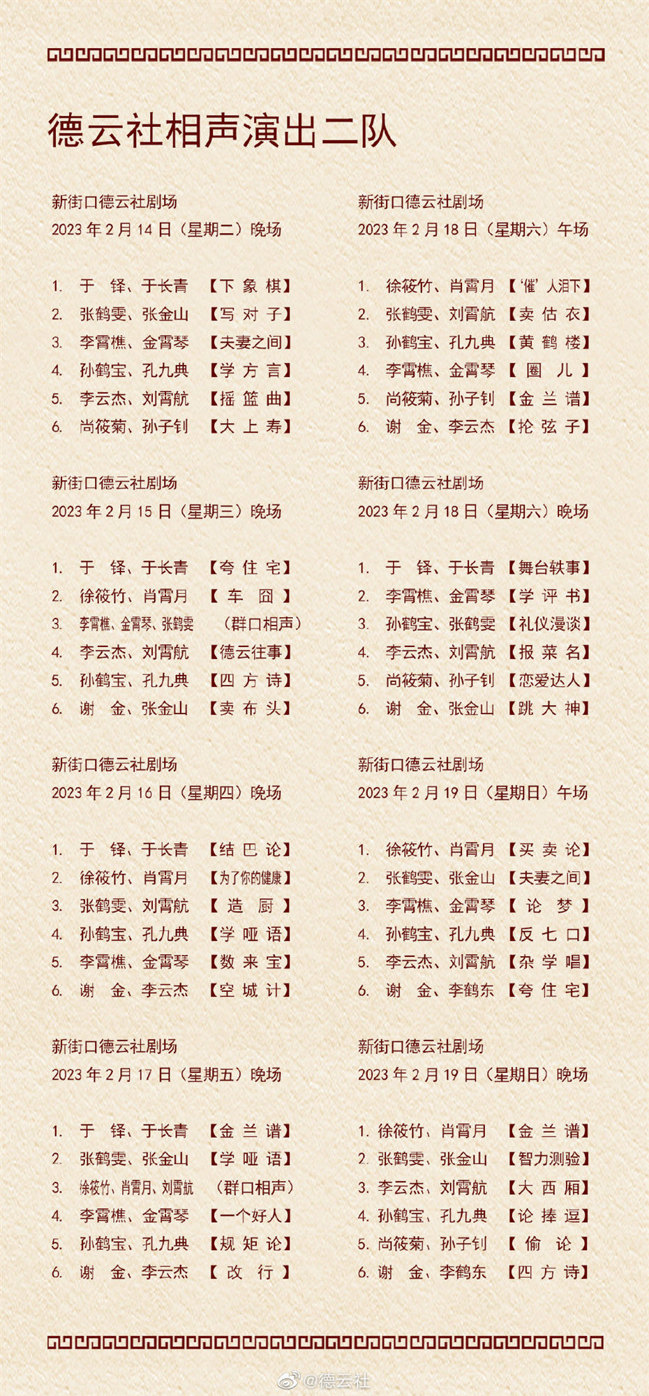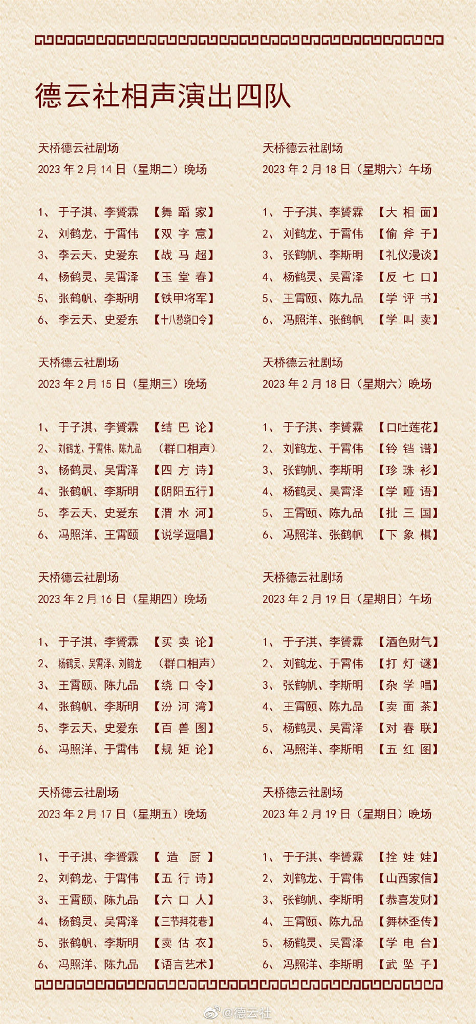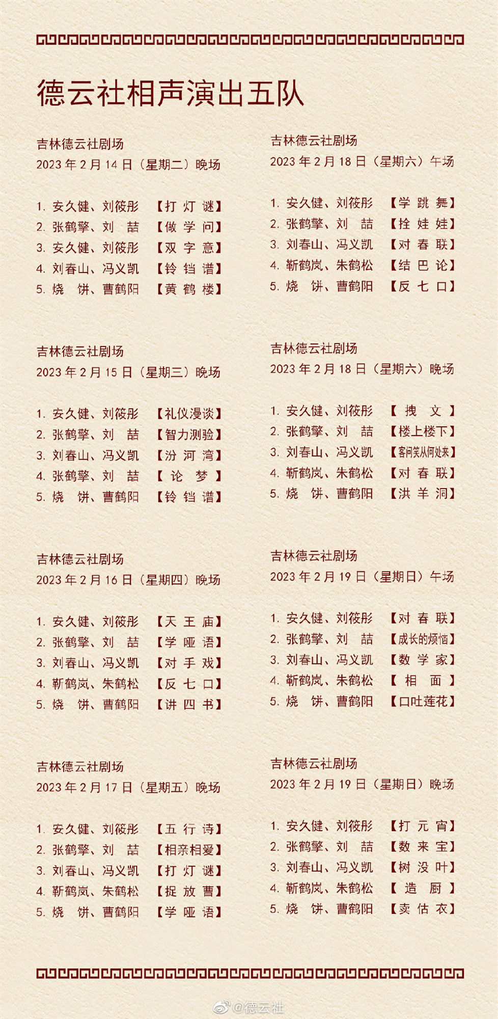 日前,德云社公布了2023年2月13日-2月19日,德云社9个小队的演出节目单。