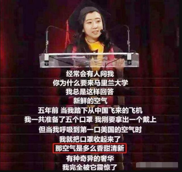 2017年,在美国马里兰大学的毕业典礼上,留学生杨舒平被选为中国留学生的代表上台发言。