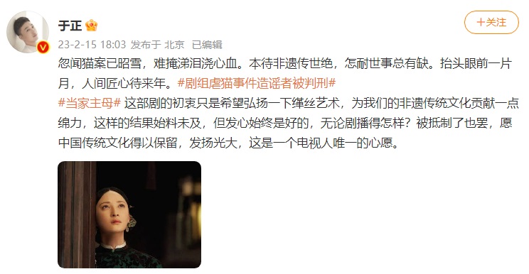![]() 随后,微博上自称是《当家主母》剧组场务人员的刘某爆料,剧组为求逼真效果,毒死了“白猫演员”。 2021年12月,相关影视公司报案。警方调取了剧组的拍摄花絮,从花絮中可以清晰地看到,拍摄时剧组用鱼线拉扯白猫,白猫倒地后有舔舌等动作。可以初步判定,猫咪并没有当场死亡,“剧组虐猫”是谣言。此后,公安机关进一步调查,证实剧组因拍摄致猫死亡等事实不成立。 此后,案件移送至东阳市检察院,承办检察官找到了猫咪的主人,并根据特征对比和证人证言,确认了“当事猫”正在另一剧组参与拍摄。 2022年3月,东阳市检察院以刘某涉嫌寻衅滋事罪提起公诉。同年5月,法院依法判处刘某有期徒刑七个月。 2023年2月15日,《当家主母》“虐猫事件”造谣者被判刑七个月的消息在网络上发酵后,该剧制片人于正写诗回应:“忽闻猫案已昭雪,难掩涕泪浇心血。本待非遗传世绝,怎耐世事总有缺。抬头眼前一片月,人间匠心待来年。” ![]() 为何对造谣者判罚如此严重??因为其造成了严重后果。 当初造谣的微博,引发1万多名网友转发,阅读量高达680万人次。9天时间内,“剧组虐猫”相关话题登上微博热搜及文娱榜37次、抖音热榜7次。仅两三天,该剧豆瓣评分就跌至2.8分,参与打分的15.5万网友中有76%给出1星差评。随之而来,广告商纷纷撤资,连带该影视公司其他作品审查进度受损,给公司造成上亿元的巨大经济损失及恶劣社会影响。 |