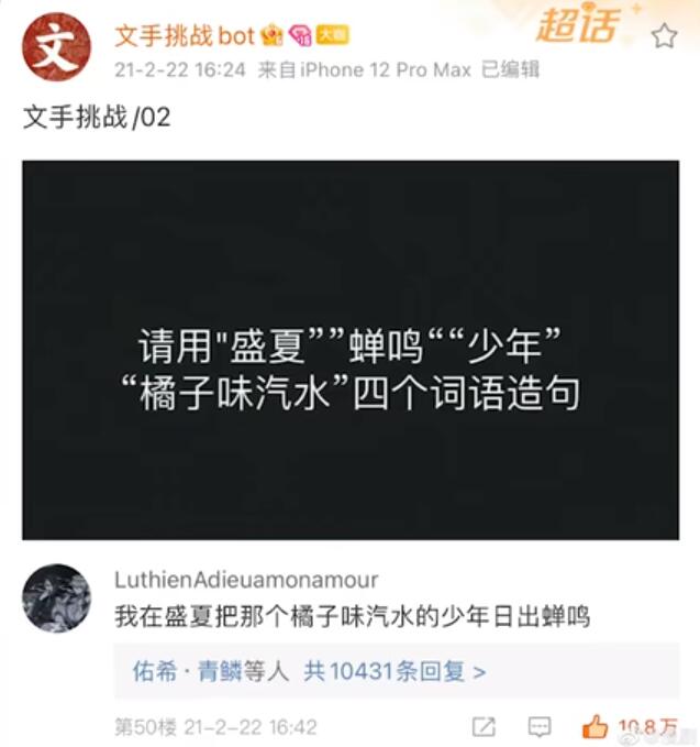 “蝉鸣文学”出自博主@文手挑战bot 一条微博,“文手挑战”是指给一个题目或是范围来让大家完善或写出一段句子。而蝉鸣文学就是出自其中一条微博的评论中“请用盛夏、蝉鸣、少年、橘子为汽水四个词语造句”。