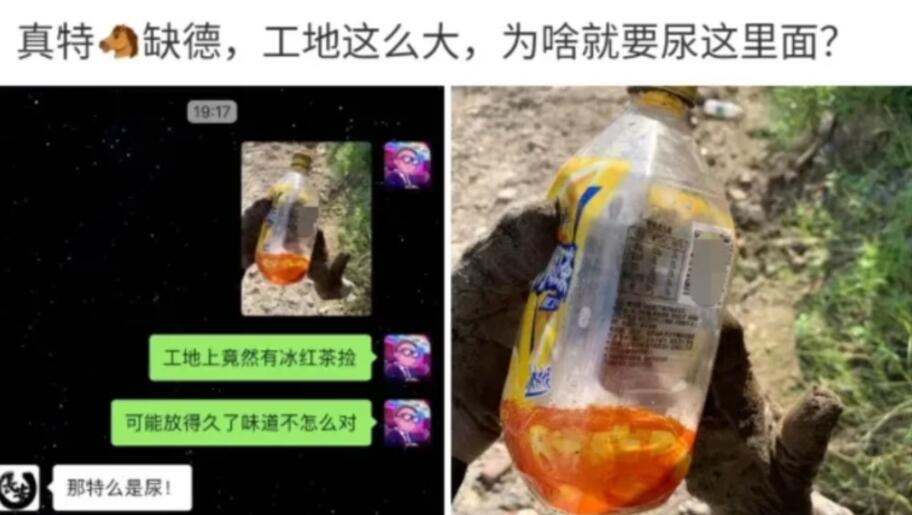 “塔吊下的冰红茶”色黄味咸略骚,浮白沫者为上品。可以说冰红茶和全国的工地尤其是塔吊是绝配,清凉好喝,量大便宜,特别是有段时间再来一瓶,中奖率提高而成为国民饮料。如果不是塔吊师傅把小便尿进空瓶子里扔下来而被一些小伙伴捡走,或许冰红茶的口碑还会更好。