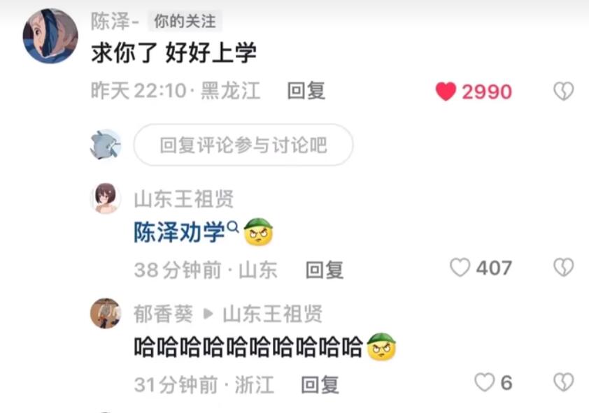 但陈泽却发现玩这个梗有很大一部分都是小学生,这让他感到了深深的忧虑。于是他开始出现在这些整活视频的评论区,劝这些学生朋友要好好学习。