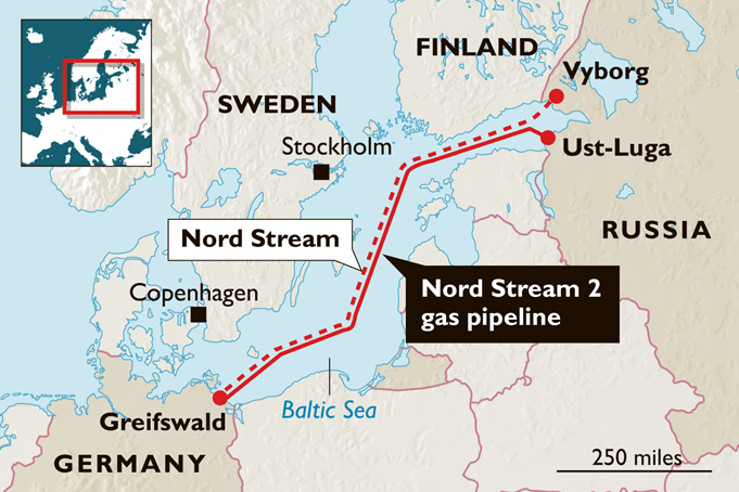 北溪二号和北溪一号示意图,两条线几乎平行的原因