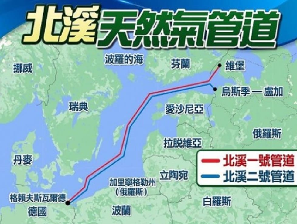 北溪天然气管道,即Nord Stream由德语“Nord”(北)与英语“Stream”(溪)组成,包含1号、2号两条平行管道,从俄罗斯维堡起步,穿越波罗的海一直到德国格赖夫斯瓦尔德,北溪1号管道于2011年5月铺设完毕,并于同年11月8日正式投入使用。北溪2号项目已于2021年9月6日建设完毕,并于同年的10月5日起开始测试送气。2022年9月26日北溪管道发生爆炸,目前普遍认为爆炸是美国人捣的鬼。