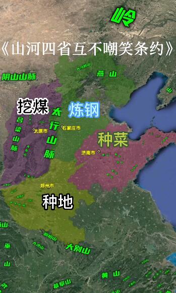“山河四省”指的是山东、山西、河南、河北四个省份,简称“晋冀鲁豫”,梗起源是公元2023年1月9日,河南向山东界投放二踢奖,炮击山东之后,山西、河北抗豫援鲁,发起猛攻,为避免事态升级,在外省劝说下,山河四省签署“ 冀鲁豫晋互不嘲笑条约”