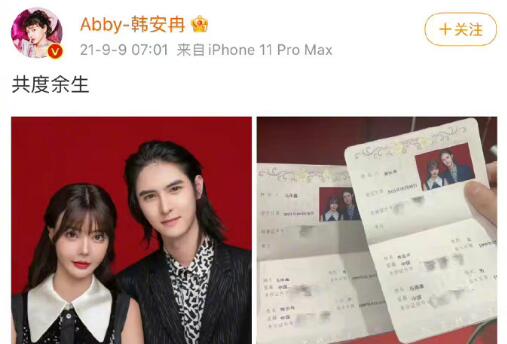 2021年9月,韩安冉再次宣布第三次婚讯,她还透露与现任马泽鑫相识几天就确立关系,不到20天就领证结婚了。