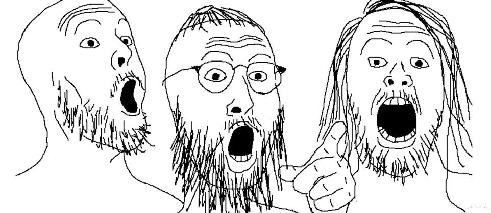 Soyjak,这个名字来源于Soyface,所谓的Soyface指的是缺乏男性特征的,有些娘娘腔的男人,自拍时常有的张大嘴表情,而Soyface就是指这类人群,这些人可能是某些事物的极端粉丝,总会迫不及待的向你展示什么东西