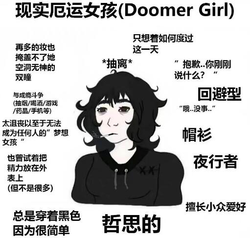doomer可能是国内最经常见到的wojak表情包。所谓的doomer,其实就类似存在于90后的一种普遍现象,他们20岁出头,兴趣小众,抑郁,缺乏交流,没有朋友,而用看起来就十分憔悴的Wojak来表现这类人确实十分合适。