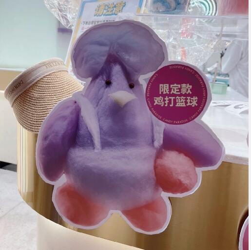 “鸡打篮球”出自某棉花糖商家最新推出的公仔周边,造型是一个竖着中分,穿着背带裤,手持篮球的鸡。