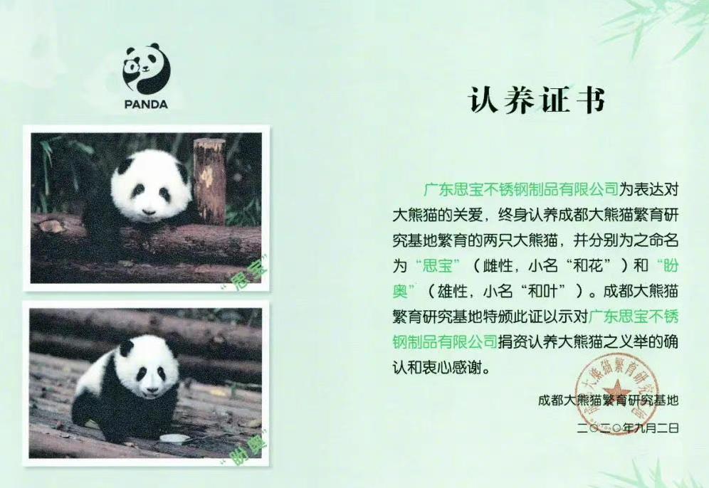 近日,大熊猫“和花”(花花)因其可爱形象和经常被小伙伴“夺笋”抢食走红网络,成为“熊猫界女顶流”。广东思宝不锈钢制品有限公司公众号显示该公司2020年7月4日,认养了大熊猫“和花”“和叶”,并再次命名为思宝和盼奥。广东思宝不锈钢制品有限公司经营范围包含生产、销售:五金、不锈钢制品、玻璃制品,销售金属材料、五金机械、家用电器、纸塑包装品。