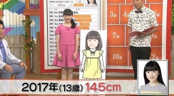 在2017年,芦田爱菜13岁的时候,有一个关于她的身高数据是145CM,当时参加综艺节目的时候,现场量取了她的身高如下: