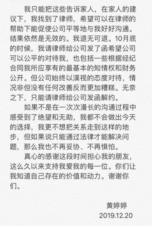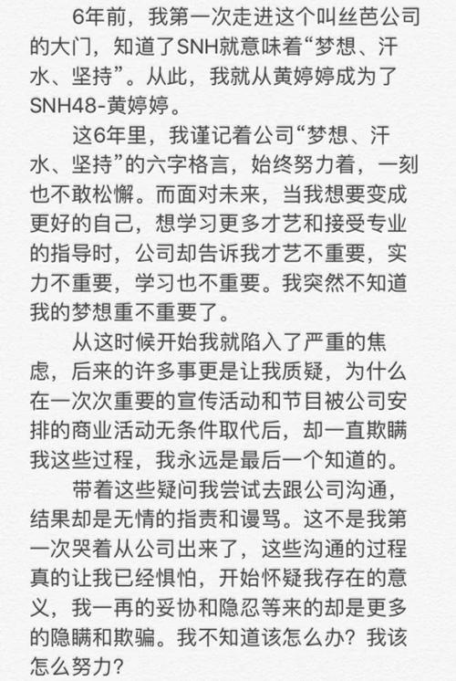 2021年12月20日,SNH48成员黄婷婷在微博单方面发表律师声明,与上海丝芭文化传媒集团有限责公司解除经纪合作关系。随后,黄婷婷又发文解释了单方面解约的原因。她称,“为什么在一次次重要的宣传活动和节目被公司安排的商业活动无条件取代后,我永远是最后一个知道的。我尝试和公司沟通,结果却是无情的指责和谩骂。这不是我第一次哭着从公司出来了,这些沟通的过程真的让我已经惧怕,开始怀疑我存在的意义,我一再的妥协和隐忍等来的却是更多的隐瞒和欺骗。”