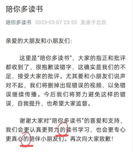 很快,黄多多因读错字进行了道歉称:“这确实是我们的不足,接受大家的批评”。然而在道歉书中,网友发现,里面多个“的”使用错误,“努力地”、“真心地”,她都写成了“努力的”、“真心的”,副词应该用“地”。