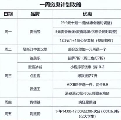 “穷鬼套餐”原本说的是像疯狂星期四这类活动的套餐,由于优惠力度大而被称为穷鬼套餐。一开始是餐饮商家们为了竞争推出的活动,后来相继模仿,基本一周的每一天都有相关的活动: