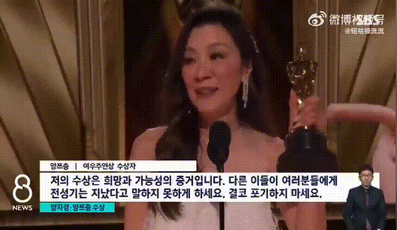 下面是韩国SBS新闻在报道杨紫琼获奖感言时故意将提到的女性部分剪掉,杨紫琼:“各位女性(SBS剪掉了这句),不要让任何人去定义你年华已逝,永远不要放弃!” ![]()