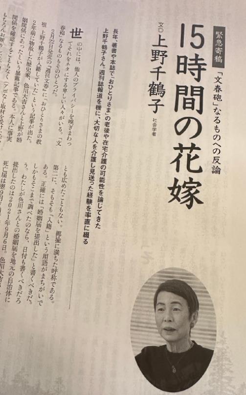 在2月22日发行的《周刊文春》中登载了“单身教的教祖,上野千鹤子已经结婚”的文章,爆料了2年前去世的历史学家,色川大吉和上野是夫妻关系。文春不仅在没有向我进行过任何事实确认的情况下发表了文章(对方没有预约就找上门来取材,我当然拒绝了),文中甚至还有错误的部分,为了捍卫我自己,我不得不如此进行说明,这实在令人不快至极。