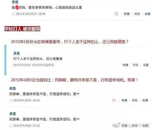 ![]() 在贴吧里面,还有网络上还流传这一些视频、图片来证明林允校园霸凌事件,比如下图2012年的时候疑似“费霞”的账号发布了一些信息如下,这些信息里面疑似“费霞”的人说:“打个人至于这样的么,还让我搬寝”,被网友认为是林允校园暴力的证据之一。 ![]() 下面是有微博网友(https://weibo.com/u/6332953180)关于林允校园暴力事件真相的澄清,比较长: