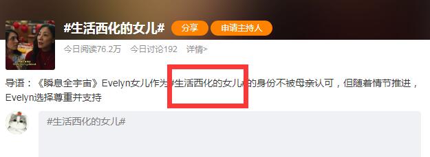 出媒体为杨紫琼电影《瞬息全宇宙》做的介绍:Evelyn与女儿Joy的表层矛盾已经得到呈现——女儿作为“生活西化的女儿”的身份不被母亲认可,她不愿意女儿在外公面前出柜。但随着情节的推进,我们发现这并不是这对母亲之间唯一的矛盾:获得穿梭宇宙能力的Evelyn发觉,她要对付的大反派就是自己女儿。在阿尔法宇宙,Evelyn望女成凤心切,最终把女儿逼至疯魔,成为Jobu,而Jobu在不同的宇宙间穿梭,只是想要毁灭一切 ——这似乎是对当下宇宙的扭曲镜像反映。最后她选择理解尊重,相信女儿