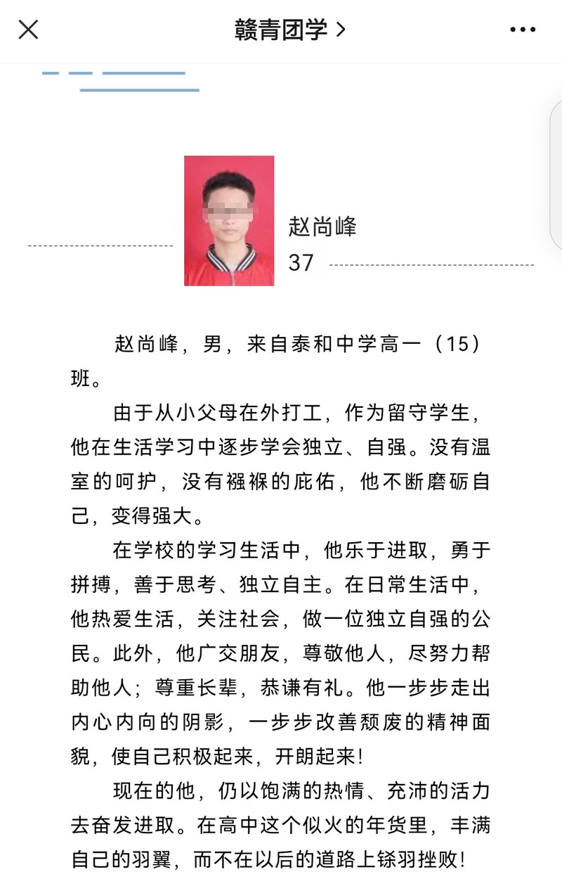 ![]() 据悉,赵尚峰,苏州大学2019级商学院学生,泰和中学201xxx班长,目前已考进中南财经政法大学研究生复试。是受害者曾经的高中同学兼曾经好友,同时也是几乎所有受害者的多年同学或好友。 ![]() 下面是赵尚峰在高中时期学校的简介,看起来本来是一个非常励志的孩子。