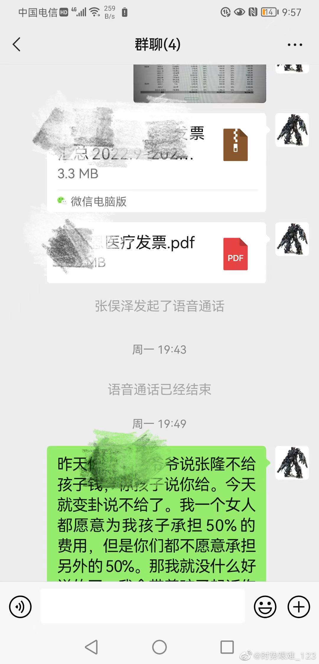 你我2022年8月份办理离婚(图二离婚证有离婚时间),2022年9月到2023年2月,需要男方承担的另外一半抚养费人命币3万余元,发票发给你们后,你和你父母都拒绝支付(图三微信截图为证)。你婚内出轨,我及时止损与你协议离婚,也让孩子远离你们。本以为离婚也给你们保留了体面,没有曝光你们的丑恶嘴脸,是希望你和你父母能看在孩子是亲生的份上,对他们好。真实高看了你们,你母亲孩子奶奶甚至当着孩子的面说,你们肯定会再生孙子。人坏到根,便是无药可救!对不起,这已经完全超出了我的底线,恕我忍无可忍!请你和你家人记住,即使道德不能约束你们,法律也会要求张隆必须对孩子尽抚养义务。