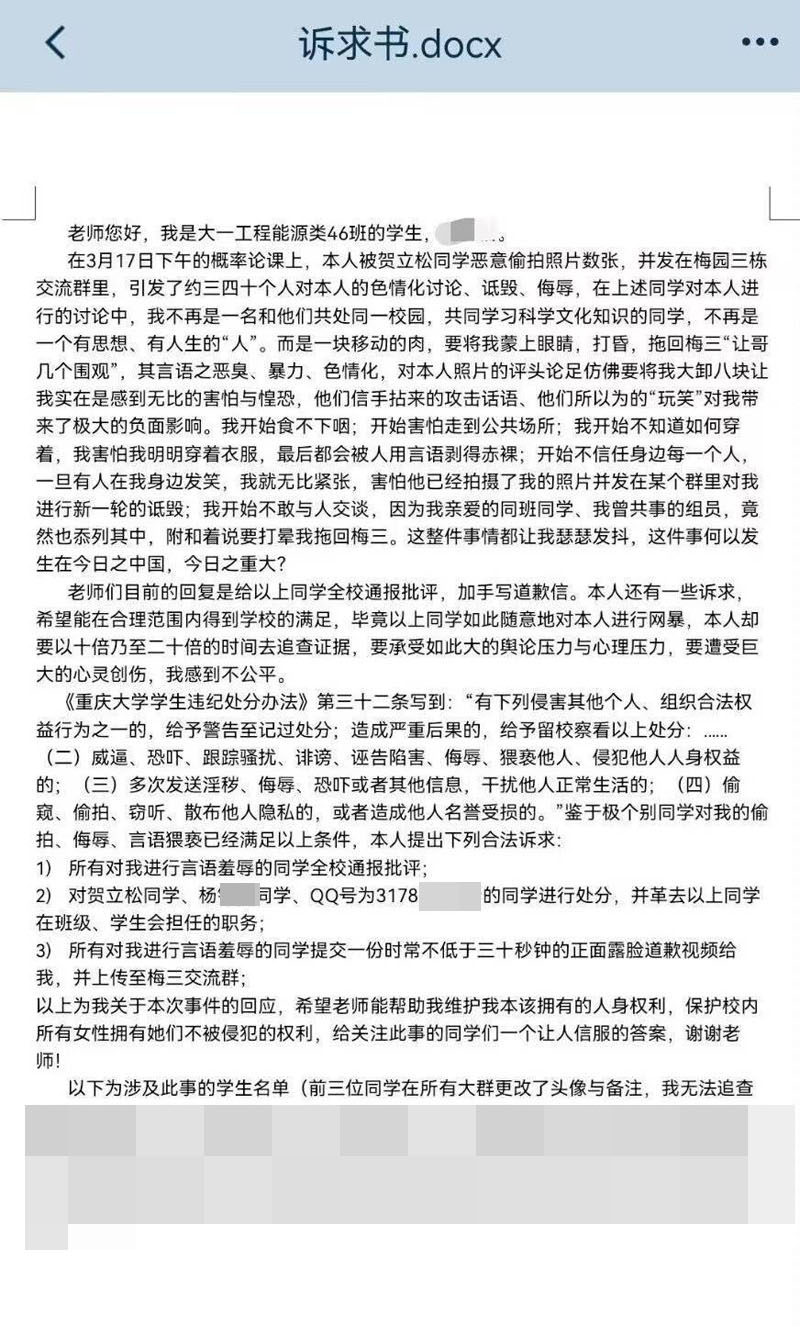 “重庆大学贺立松事件”指的是重庆大学的学子贺立松,偷拍了一张女同学上课的照片,然后发到群里面,群里面的不少同学开始对此YY了很多不恰当的言论。在女同学得知后,向学校发了一封《诉求书》,而贺立松也发了道歉声明如下:“同学们,我叫贺立松,鉴于我今天做出的事造成了如此不好的影响,我在此做出深刻检讨,这件事应我而起,我不该拍别人照片并发到网上评头论足,以至于带领群里其他同学发布了一些有不良影响的言论,如果我没有因为一时口快而说出这样的话,并带领群里其他成员继续将这个事件持续发展下去,这位女同学也不会因此而遭受到不必要的伤害和侵犯。在这里,我为自己的行为做出深刻反思,并发誓以后不会再做出同样的事,同时,我应该要为我偷拍的女生做出最诚挚的道歉.”