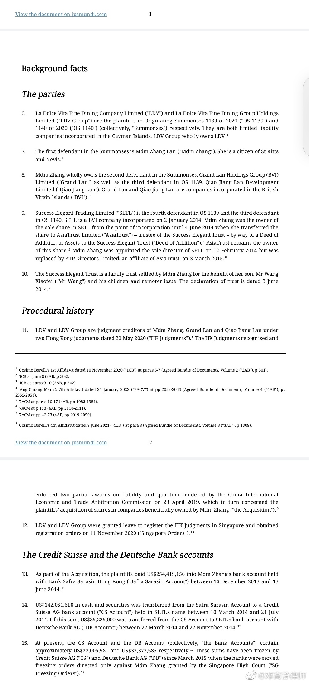新加坡高等法院做出的判决里记载,因履行收购协议,CVC方于2013年12月16日至2014年6月13日期间向张兰的嘉盛银行账户转账2.54亿美元,2014年3月10日至2014年7月21日期间张兰将其嘉盛银行账户里1.42亿美元的资产转至以SETL(一家张兰实际控制的离岸公司)名义持有的瑞士银行账户(“CS账户”),其中8522.5万美元于2014年3月27日至2014年11月27日期间从CS账户转入SETL在德意志银行的账户(“DB账户”)。目前,CS账户和DB账户剩余存款合计约5537.8万美元(注:2014年转入金额合计是1.42亿美元)。【CS账户和DB账户是张兰设立的家族信托的银行账户】