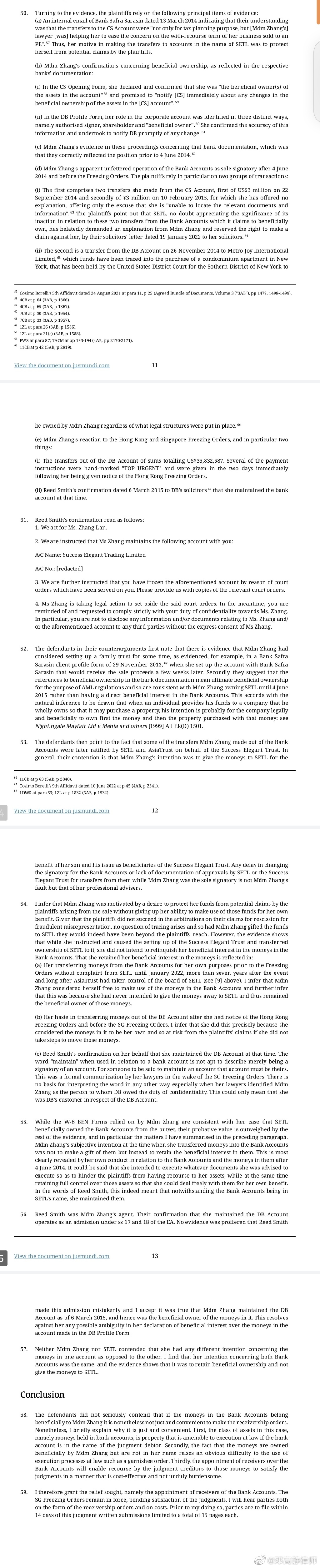 张兰声称信托资产与她无关。但是,张兰却数次以唯一授权人的名义从上述家族信托账户里转出钱款,这些钱款的用途包括在纽约购买公寓;在香港法院发出冻结令之后及新加坡法院发出冻结令之前,张兰以最高紧急的要求指示将钱款转出;张兰的代理律师也书面确认过张兰才是CS账户和DB账户的实际所有人。
