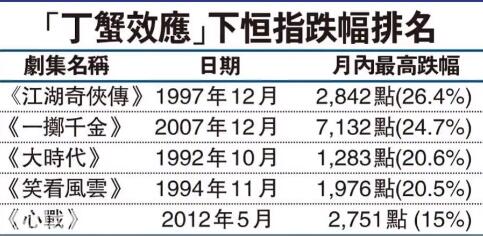 1992年香港电视播放由郑少秋主演的电视剧《大时代》故事讲述由郑少秋饰演的丁蟹运气爆棚,经常在股票市场中的熊市,借着抛售恒生指数期货而获取暴利,正好当时香港股市暴跌,股民损失惨重,因此得名“丁蟹效应”。