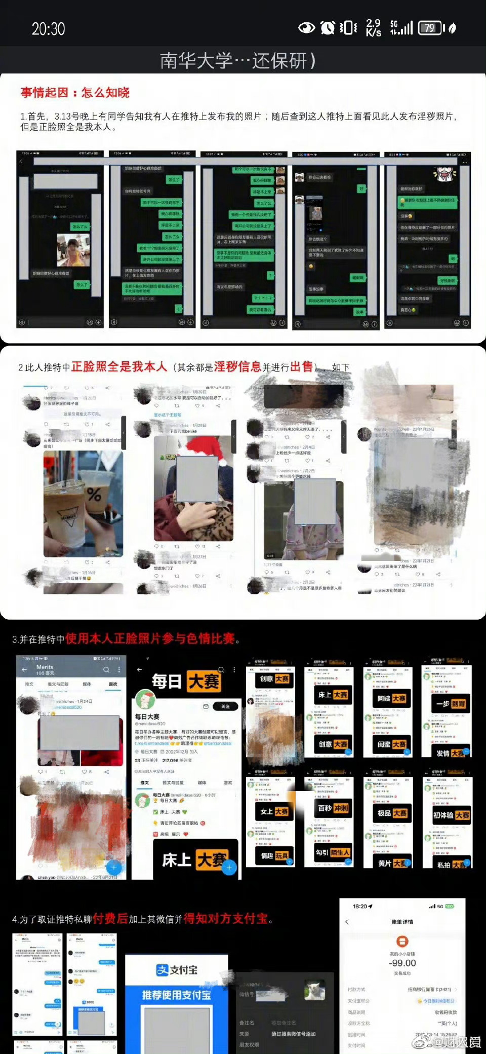 “南华大学何某程造黄谣事件”是一南华大学的学生公布出来的,她写道:“大家好是这样的,我被南华大学资源环境与安全工程的一个同学(何某程)造黄瑶且拿我正脸照制造错觉盈利多年。现在已经报警立案,中途这段事件对我来说非常内耗和难以启齿。巨大的浏览量让我本人位居,现在在警方帮助下立案,所以希望南华大学那边的处理,但是还是力量太小希望得到帮助。”