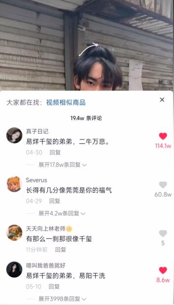 如视频作者@哼哈二将 ,他和四字弟弟的相似度高达90%,于是网友调侃他是“宛宛类卿”是易烊千玺的弟弟“二牛万悲”