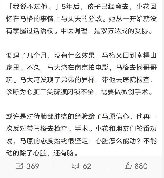 有网友也把马格的死都归结为“中年文艺男”愚昧和疯狂。马格患有先天性心脏病和马凡综合症,马原不让孩子看医生,接受治疗,说“心脏和脑子是不能动的”。