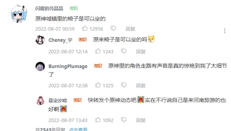 原本是让玩家讨论游戏细节,是一条很正常的动态。一开始大部分玩家都在讨论游戏内容,诸如巫师三、旷野之息的记忆点等等。时间来到8月7日凌晨,一个名叫@闪耀的亮晶晶 的玩家突然在动态下发表了这样的言论“《原神》城镇里的椅子是可以坐的”,与前面的几位玩家的细节比起来,椅子可以互动的设计并不是什么稀罕事,就像是大家都在比拼手机性能时,他说了句我的手机能上网一样,过于突兀的台词被玩家广泛传播,因为游戏本身的热度极高,评论区画风突变,到处都是诸如"原神XX,可以XX"的句式,不管是否为《原神》玩家都加入了这场狂欢当中。