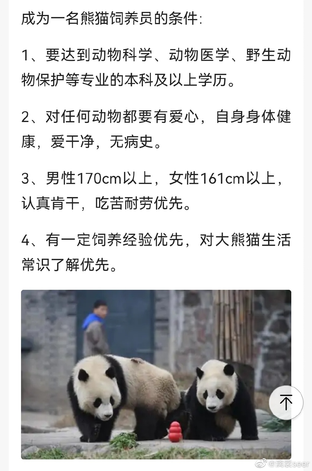 这个新闻说明,大熊猫饲养员不是什么人都可以当的,还是有很多条条框框的(岗位要求:http://www.96845.com/article/2023/8293.html),不过在这条新闻的评论区大量网友表示:“那为啥张鑫还能干”,网友之所以这么说,是因为张鑫曾是中国大熊猫保护中心的饲养员,但是根据公开资料显示,他并不是一个合格的饲养员,有一段视频显示,张鑫曾经殴打大熊猫华妮,网友认为华妮有抑郁症倾向可能就是张鑫不当饲养导致的,下面是张鑫殴打华妮的视频画面: ![]() 张鑫被网友举报之后,并没有被进一步的处罚,而是被派到了上海野生动物园照顾大熊猫帼帼和花生,2016年12月底21岁的帼帼和出生175天的花生宝宝相继去世,在猫粉的一再追问下,官方在帼帼母女去世20天后公布了死讯,随后猫粉爆出了大量张鑫不穿防护服、不消毒、在花生圈舍外吸烟、带外人随便进入花生圈舍的照片。 ![]() 目前来看,张鑫仍然在饲养熊猫,有网友说目前他在碧峰峡熊猫基地工作,至于张鑫为什么这样的条件也能当熊猫饲养员,网络上有很多资料,这里不展开详说了。 ![]() 图为张鑫 ![]() |