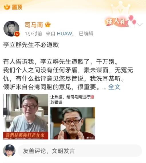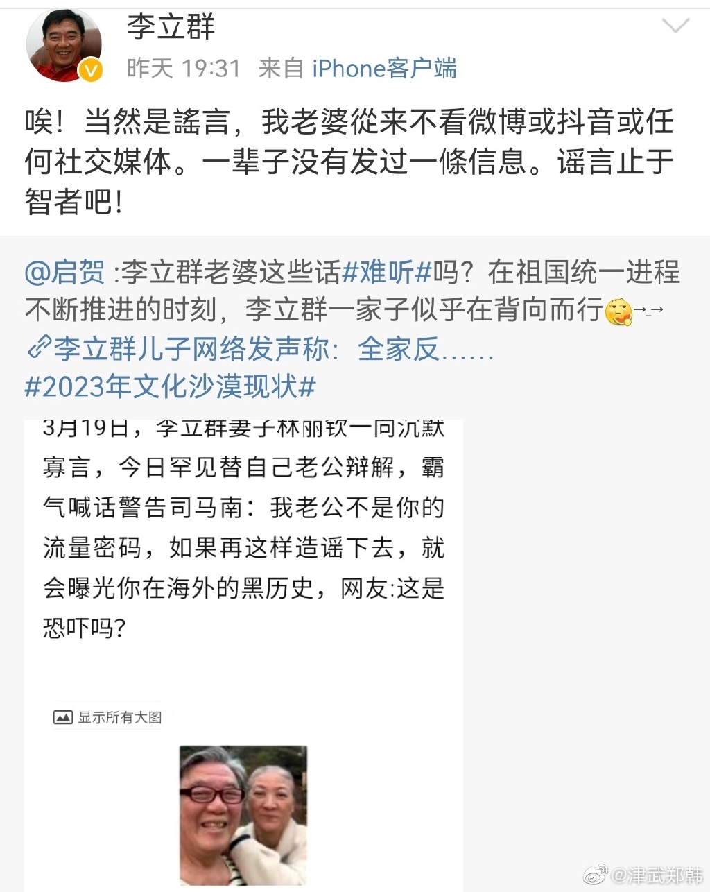 ![]() 后来李立群觉得自己说的不妥,提前给司马南道歉了,没想到司马南不依不饶,用李立群当年“死守台湾”的言论来回击他 ![]() 然后,网络上自媒体开始发酵一段炒作,说李立群的老婆林丽钦警告司马南:“我老公不是你的流量密码,如果再这样造谣下去,就会曝光你在海外的黑历史。” 不过对于这段霸气的警告,李立群看过后表示,这不是真的,自己的老婆不玩微博,不玩抖音,更不会这么霸气的警告。 不得不说,现在的自媒体为了流量,还真是什么都干的出来啊! ![]() |